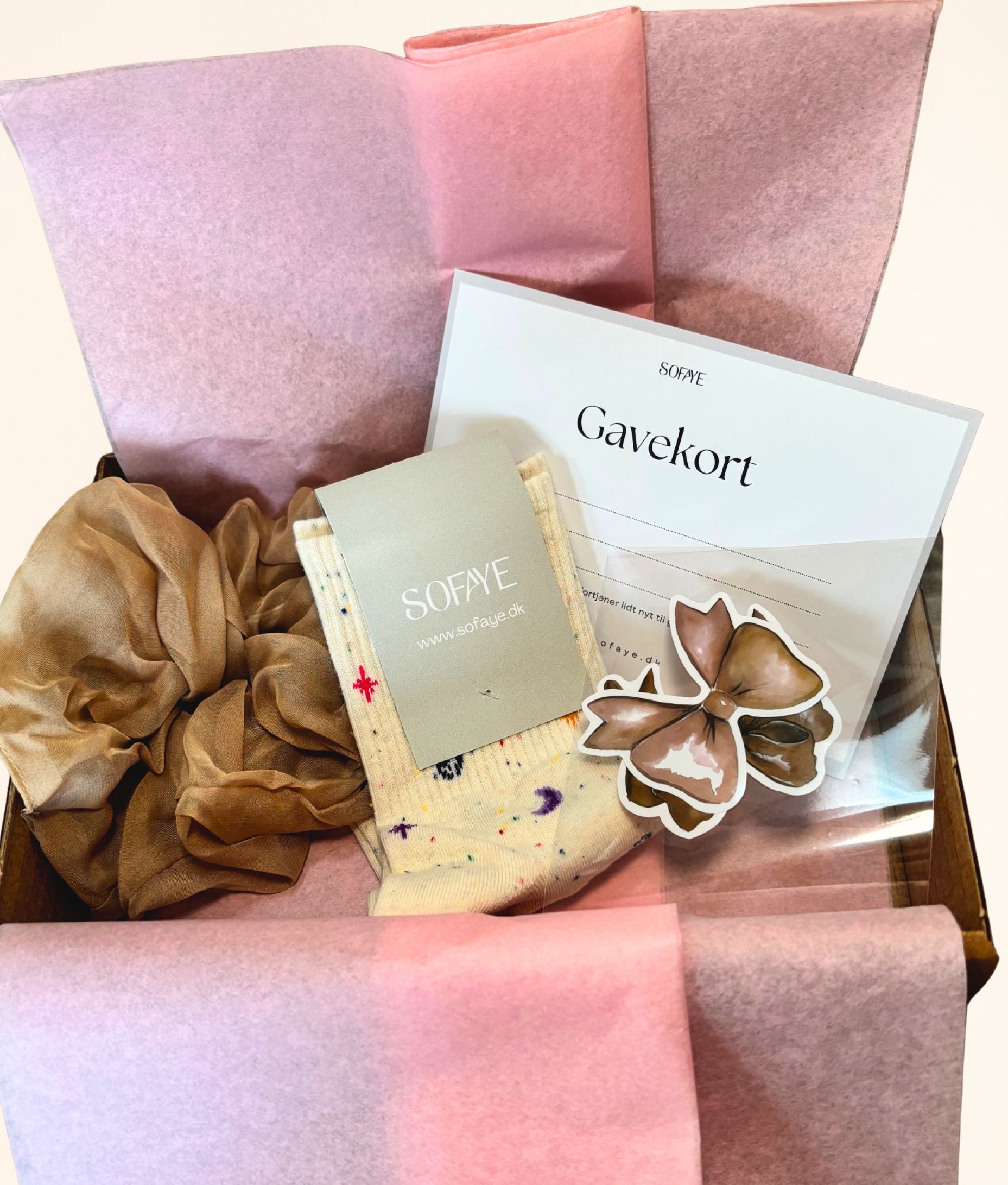 Gavekortet kommer pakket i en æske med silkepapir og en lille håndplukket Sofaye-surprise, som kan være alt fra strømper til sløjfer eller scrunchies.