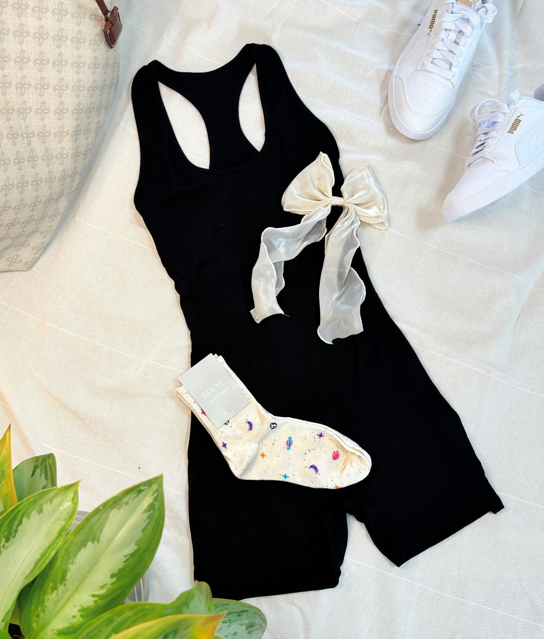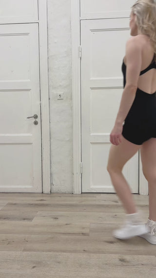 Let, stretchy og flatterende. Fine Rib Jumpsuit er lavet i et let og åndbart materiale med smalle ribstrukturer, der følger kroppen uden at stramme. Det lette materiale, åbne ryg og tætte pasform gør den perfekt til både dans, stretch eller måske endda bare dage til hyggelige dage hjemme.